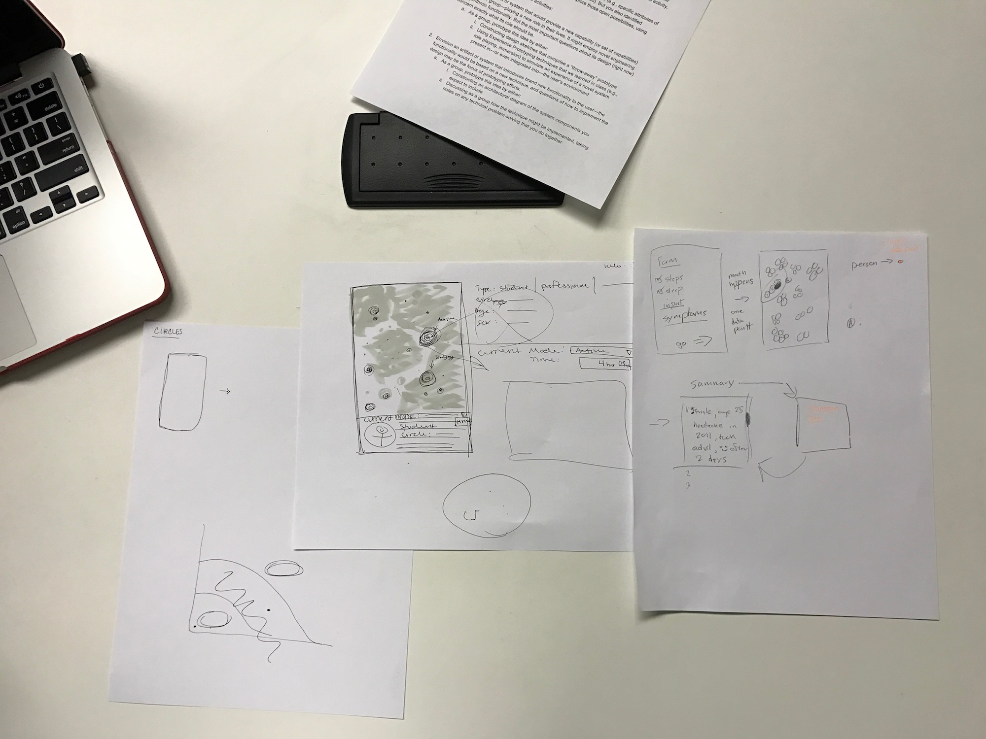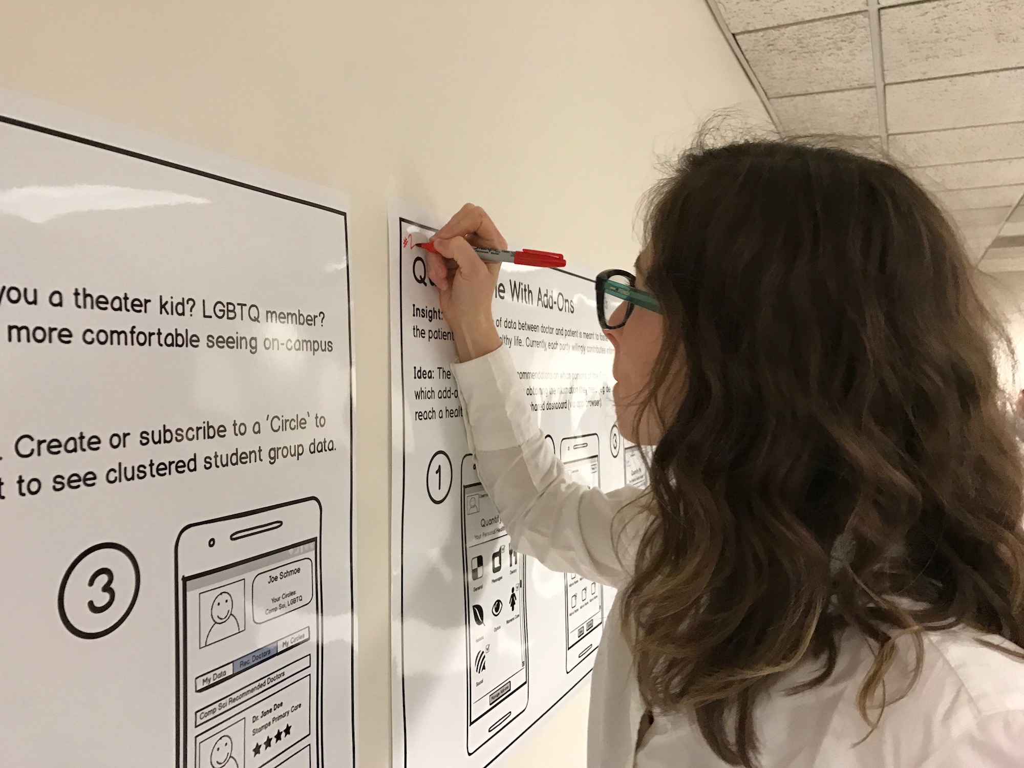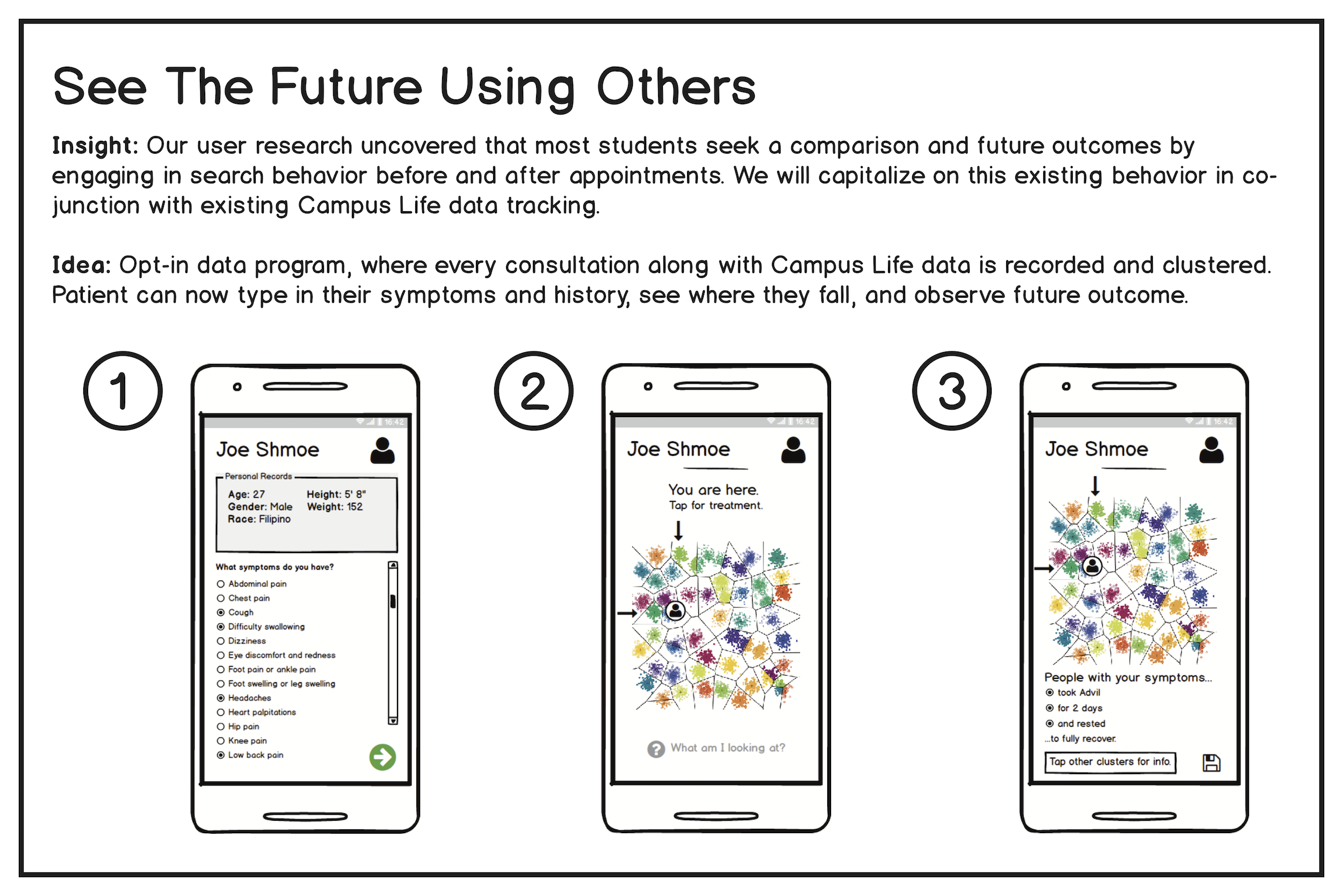 With these three ideas, we storyboarded each for a poster presentation. The ideas ranged from a completely human-centered health identification system to a data-driven system that visualizes social context. Classmates anonymously voted for each idea using colored stickers.