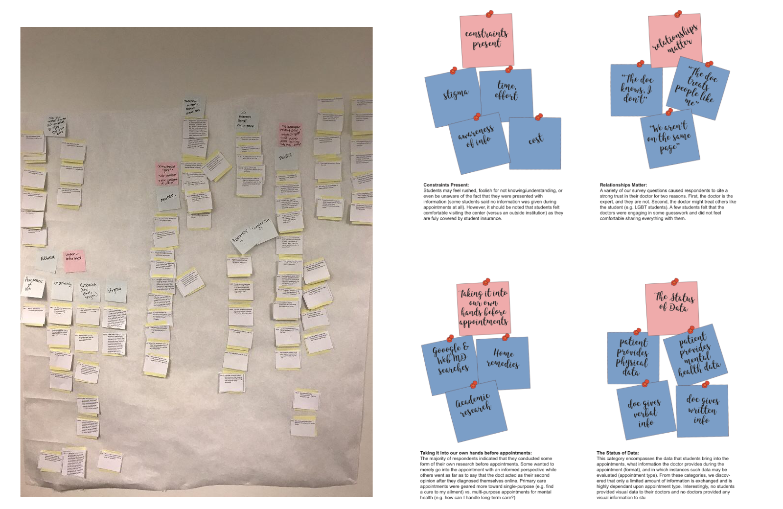 After we gathered initial user research data, we made a paper affinity diagram (left) to construct themes and related concepts from a bottom-up approach. We later focused our findings into high-level categories via a digital revised version (right).