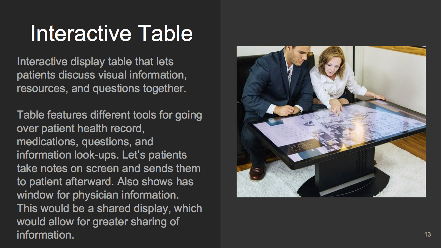 Our group identified a few key areas to improve on for future work, including the ability to filter information quickly when visualizing data, an option to save the discussion for later use, and ensuring the prototype height could be adjustable to accommodate more people.