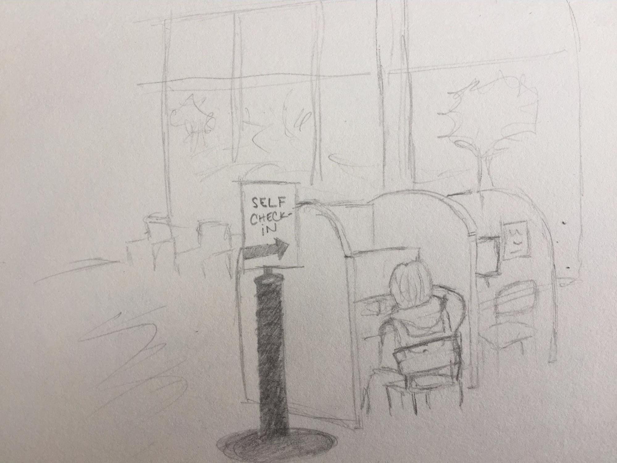 R: Student swipes BuzzCard or types in Student ID at 1 of 4 lobby desktop computers each with a privacy desk. Student answers questions pertaining to primary care appointment.